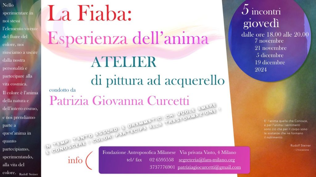 Ogni fiaba è come una perfetta pianta fiorita che si manifesta seguendo chiare leggi. Ascoltarla, osservarla, dipingerla con gli acquerelli seguendo un processo pittorico autentico, conduce ogni persona ad un contatto profondo con se stessa e al di là di se stessa.