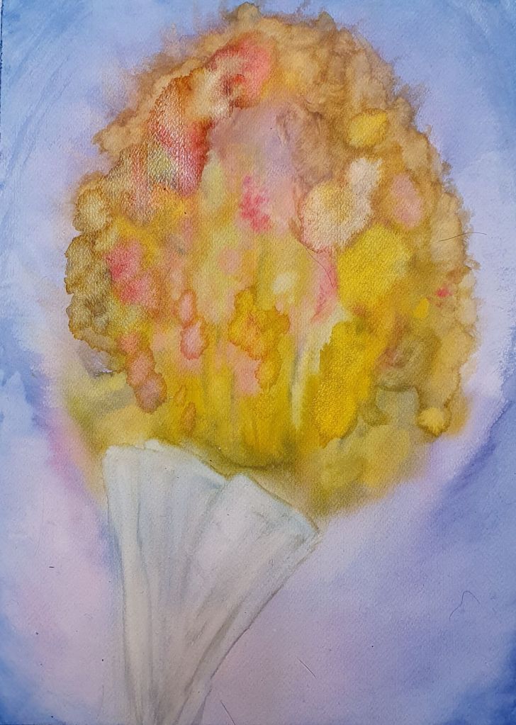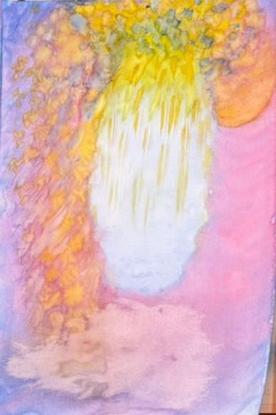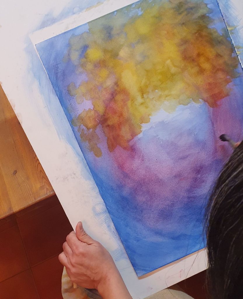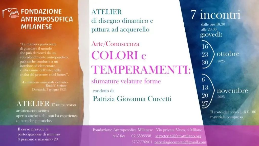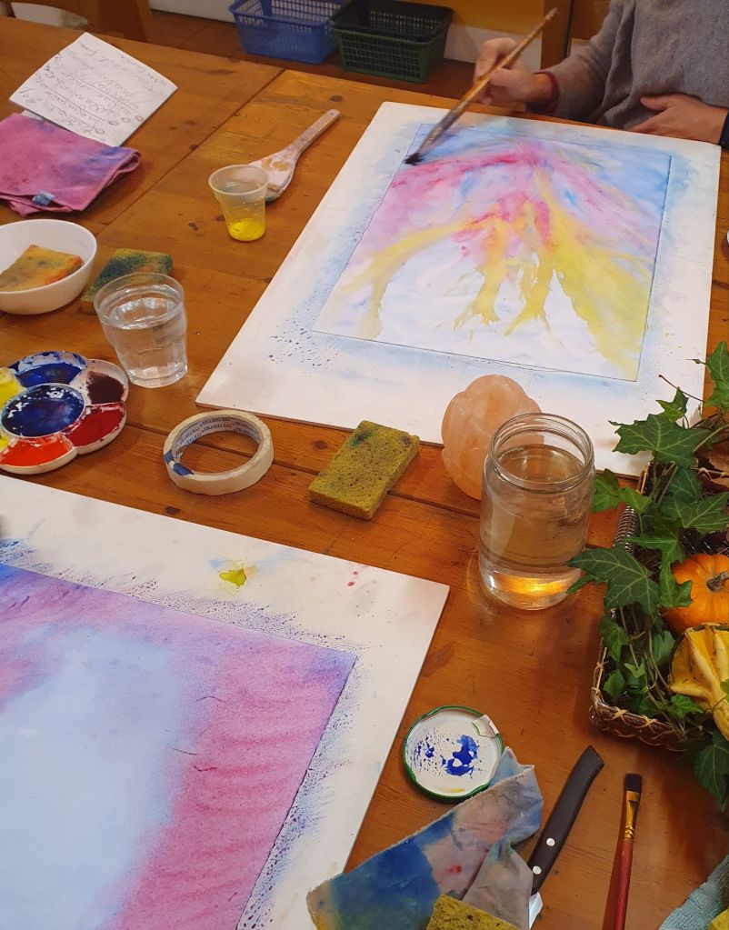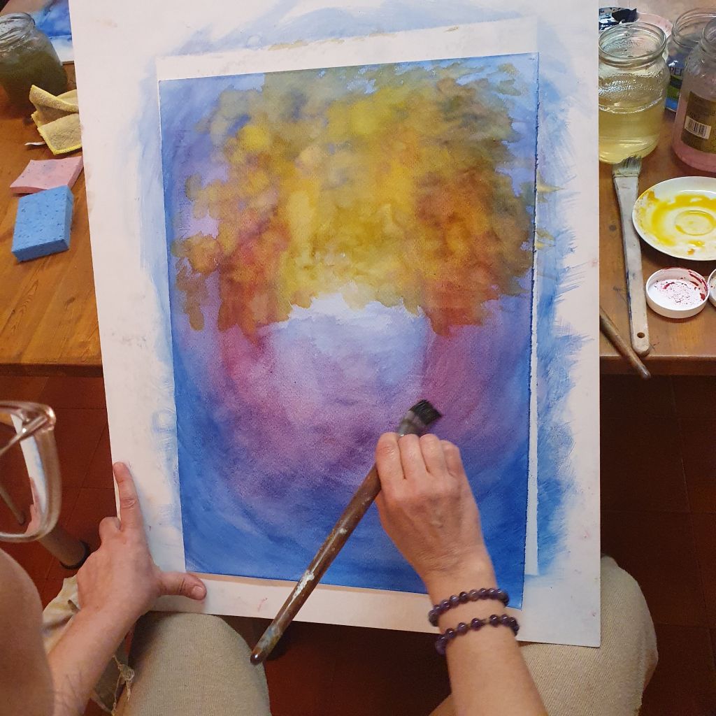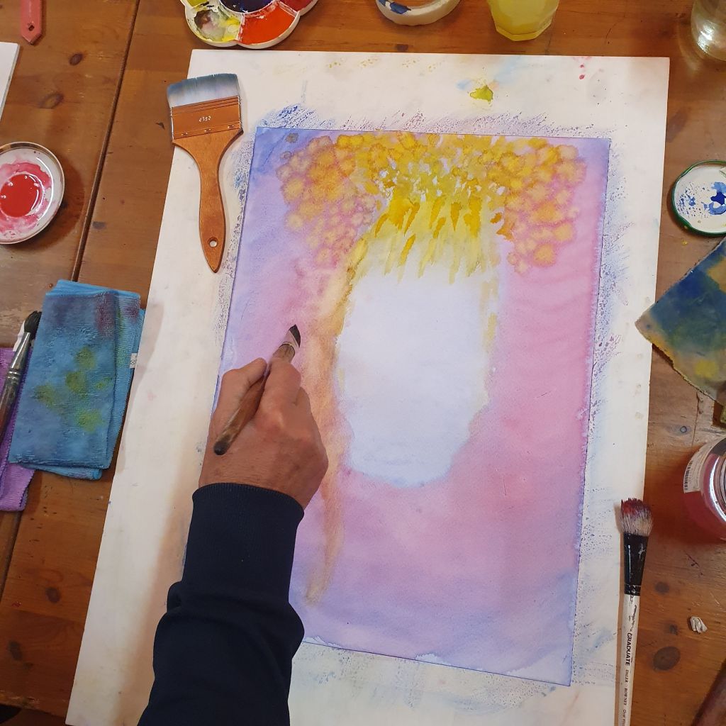 Abbiamo raccolto conoscenze, osservando come ogni temperamento si esprime in ciascuno di noi. Nell’esercizio, il colore è al servizio della atmosfera e della forma. Si crea così un vaso che contiene i gesti , i fiori/ conoscenza, che abbiamo fin’ora colto. Ognuno li porta a manifestarsi nella forma, rispettando sia il ” gesto” del colore, sia la propria individualità. Un equilibrio di movimenti che scaturisce da due fonti: l’individuale e l’archetipo, l’universale. Affinare la propria sensibilità mentre osserva e fa esperienza delle due fonti è un percorso che va verso l’unione di arte e scienza